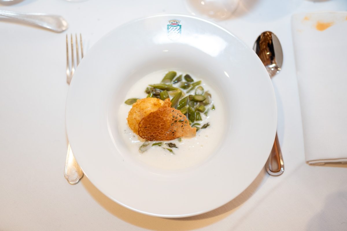 Chiudiamo la cena con il secondo dello chef di Castelconturbia Alan Tosi e il suo uovo poché fritto su spuma di Parmigiano “Vacche Rosse” e asparago “Violetto” ripassato.