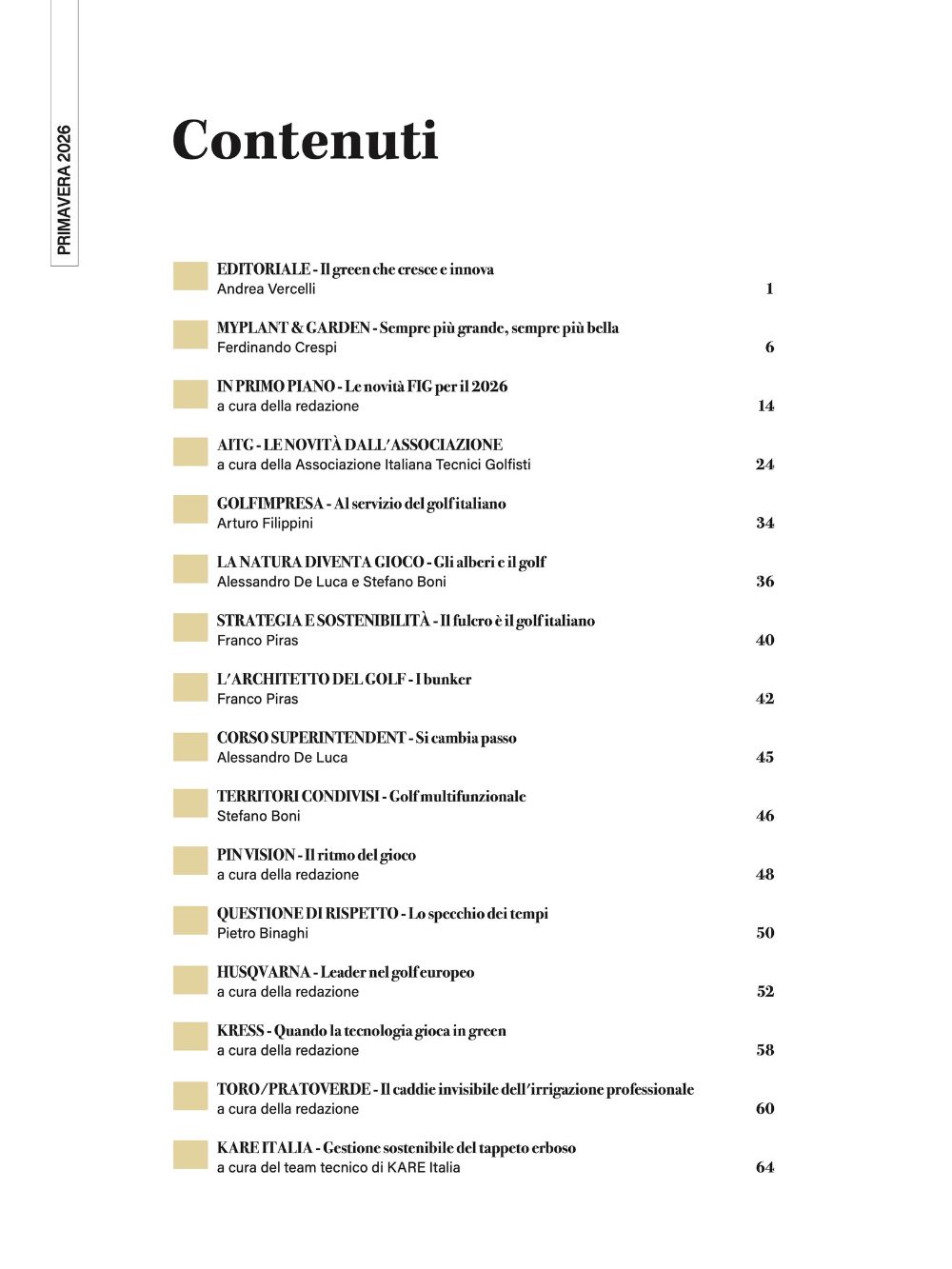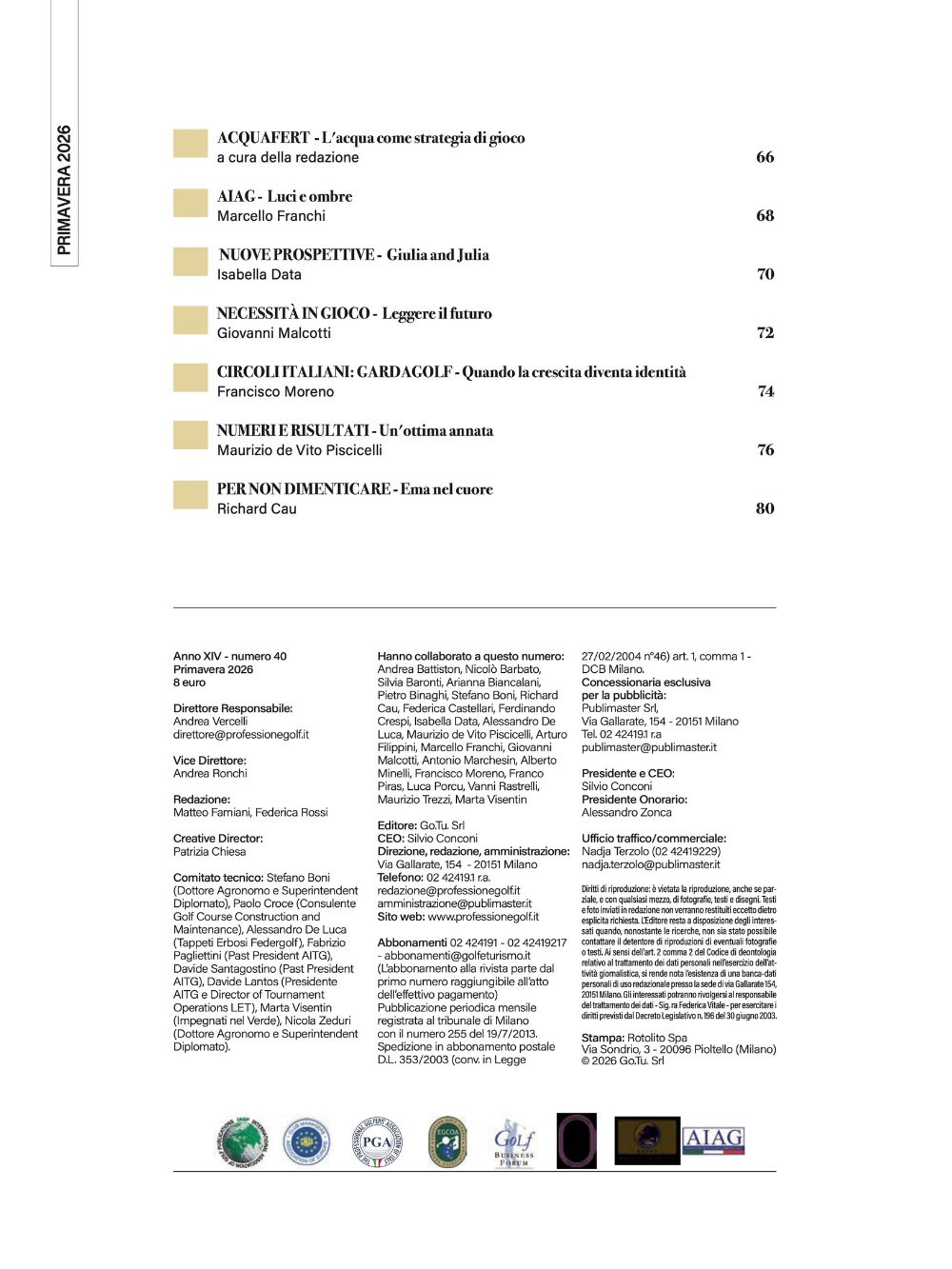 Il numero racconta le novità 2026 di AITG e Golfimpresa, le due più importanti realtà italiane per la crescita e lo sviluppo del golf. L’Associazione Italiana Tecnici di Golf ci parla della cura e manutenzione degli alberi, del rapporto con la fauna nei campi e dei benefici del Biochar. Arturo Filippini, presidente di Golfimpresa, spiega le novità della stagione alle porte che vedrà un aumento della formazione e dei servizi per i club consorziati.
