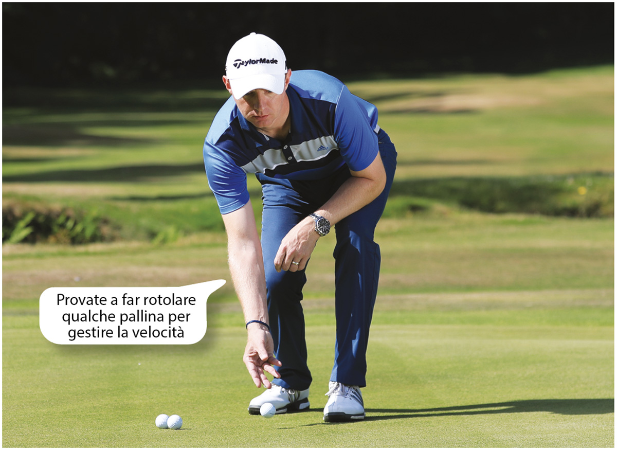 Poi guardate la buca e fate qualche prova per avere davvero un’idea del putt. Immaginate di far rotolare la palla usando mani e braccia: è un’ottima pratica per acquisire un buon controllo della velocità. E se il controllo della velocità migliora, imbucherete più spesso da lontano e farete meno volte 3 putt.